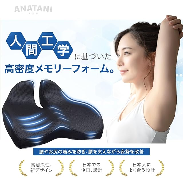 [日本デザイン プロ仕様] 坐骨神経痛 クッション 腰痛 クッション 低反発 椅子用サポート 姿勢矯正 オフィス 自宅向け 滑り止め 通気性あり ブラック ANATANI PRO