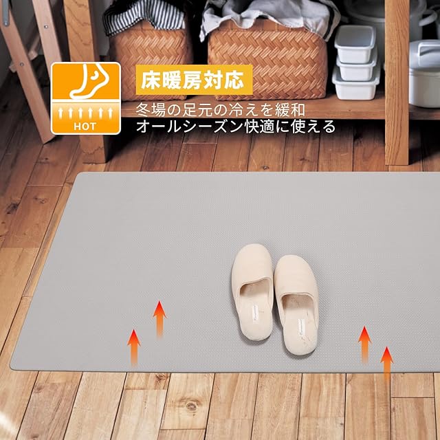 ✅【冬場でも快適に使える】PVC素材のキッチンマットは見た目が寒い」「踏むとひんやりしそう」という印象がありませんか?あるキッチンマット比較実験で、50度前後のお湯をそれぞれのキッチンマットの上に置き、お湯の温度の下がり幅を比較します。温度変化が最も少なく、高い温度を保つことができたのはPVC素材のキッチンマットでした。厚みがあるおかげで、床からの冷たさや熱を軽減し、冬季や夏季の温度による足へのストレスを和らげてくれます。床暖房対応OK。