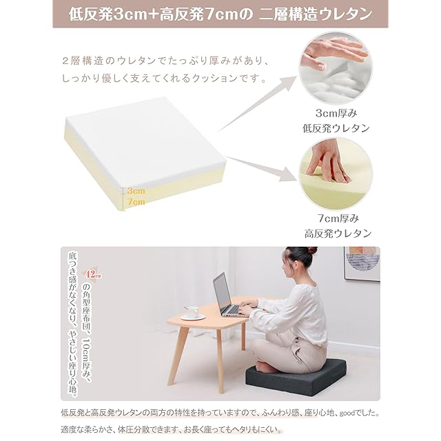 ✅【サイズ】:約幅42cm×奥行42cm×厚み10cm 本体重量:0.82kg 生地:100%ポリエステル 中身:3CMの低反発ウレタン+7cmの高反発ウレタンの2層構造