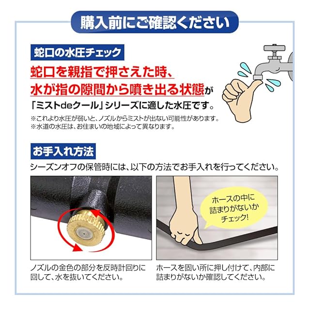 [必ずご確認下さい] ご購入されたお客様から水が漏れるというお声を頂いています。 チューブの断面が歪んでいる、またはミストノズルにチューブが奥まで差し込まれいないことが多くの原因です。 扇風機に合わせてチューブを専用カッターで切断します。 ミストノズルにチューブをしっかりと強く奥まで差込みます。 [購入前にご確認下さい] 【蛇口の水圧チェック】 「蛇口を親指で押さえた時、水が指の隙間から噴き出る状態」が適切な水圧です。 これより水圧が弱いと、ノズルからミストが出ない可能性があります。 ※水道の水圧は、お住まいの地域によって異なります。 【お手入れ方法】 シーズンオフの保管時には、以下のお手入れを行ってください。 ・ノズルの金色の部分を反時計回りに回して、水を抜いてください。 ・ホースを固い所に押し付けて、内部に詰まりがないか確認してください。