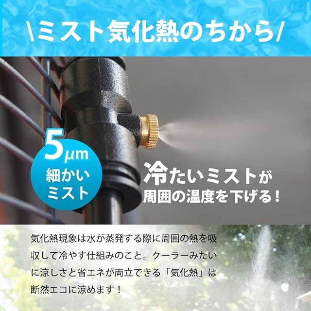 「ミストdeクールシャワー 扇風機用」は扇風機に取り付けるだけで、さらに涼しさを増してくれるミストシャワーキットです。 ミストによる気化熱に風が加わることで、体感温度は爽快そのもの。 夏の屋外仕事に扇風機だけでは熱風になって汗がとまらない… クーラーや冷風機は電気代がかかる… クーラーみたいに涼しさと省エネを両立できる「気化熱」は断然エコに涼めます! 気化熱現象は水が蒸発する際に周囲の熱を吸収して冷やす仕組みのこと。 夏の炎天下の玄関やベランダの打ち水は気化熱によって体感温度を下げてくれます。 本商品は4つのミストノズルから5マイクロメートルの細かい霧を噴射して、広範囲に涼しさを感じられます。 首振りにすると広範囲にミストを噴射できるので快適にご使用いただけます。 屋外イベントや、学校、幼稚園、店舗などの入り口付近などでのご使用もおすすめ!
