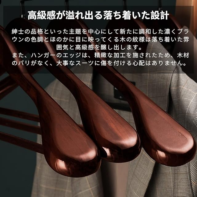 【厳しい品質基準】自社で徹底した品質管理を行い、厳しい品質基準をクリアしたものだけを出荷しています。生産から検品までの過程で、木材の割れやバリ、光沢の剥げなどの不良の有無を細かくチェックし、不良品を徹底的に排除し、高品質の木製ハンガーをお届けします。さらに、商品を無事にお届けする為に丁寧に梱包ししています。外装は高級感あるデザインにしているため、プレゼントにも問題ありません。