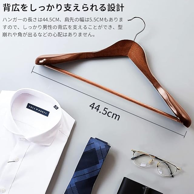 【スーツのパートナー】当木製ハンガーはジャケットとスラックス、ネクタイを一緒にかけられるため、余分なスペースを取ることがありません。肩掛けラインの角度は人に肩に近い形状に設計することで、衣類の型崩れが防止できます。バーの部分には滑り止めシリコンがついていますので、ハンガーからスラックスが滑り落ちることはありません。