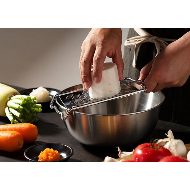 【◆フック型でスマート収納◆オールステンレスでお手入れ簡単】 直径20cm程度(推奨は20cmですが様々なサイズのボールでお使いいただけます、合わない場合返品をお受けしますので是非お試しください。)のボールにフィットするフックが付いているので、ご自宅でお持ちのボールやお皿でも力を入れやすく安定した状態で使用可能です。 薄型なので隙間に収納、壁にかけることもできます。スタイリッシュなオールステンレスの大根おろし器はインテリアを損わずお使いいただけます。食洗機にも対応しているので衛生的にお使いいただけます。