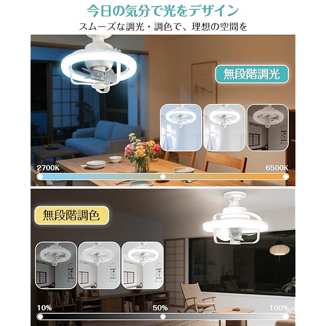 【長寿命で高演色LED・無階段調光調色・リモコン付き】ファン付き照明は優れた目に優しいLEDライトを搭載して、リモコンで「輝度/色温度調節ボタン」を長押してお部屋の雰囲気やシーンに合わせて純正色温度3000K〜6500Kの昼光色・昼白色・電球色の3色温度10%〜100%までの無階段切替が可能です。安定したLED全光束4000LMの明るさを提供し、耐用年数 50,000時間に達し、5年間交換不要で、省エネで長寿命を実現!色と明るさの変化に応じて部屋に良い雰囲気を作り出すことができます。寝室、リビングルーム、台所、廊下、書斎、玄関、トイレ、オフィスなど様々なシーンで活躍です。