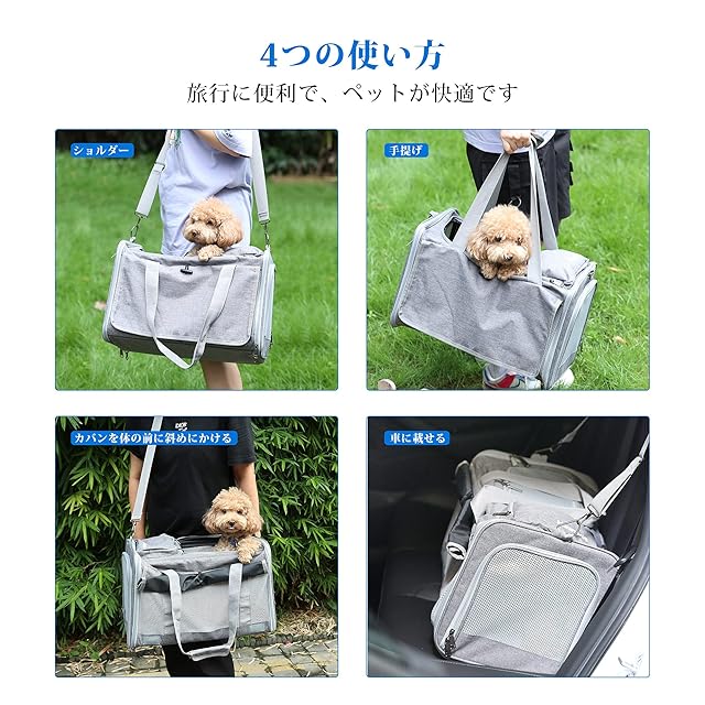 【快適、便利】 長さを調節できる肩ベルト、幅の広い肩パッド、厚みのある手提げパッドがありますので、重いペットを連れてもストレスを軽減できます。4つの使い方: ショルダー、手提げ、カバンを体の前に斜めにかける、車載。散歩、買い物、レストラン、通院、電車移動、避難などのお出かけ時に非常に役立ちます。家にいる時は、ペットの好きな巣です。