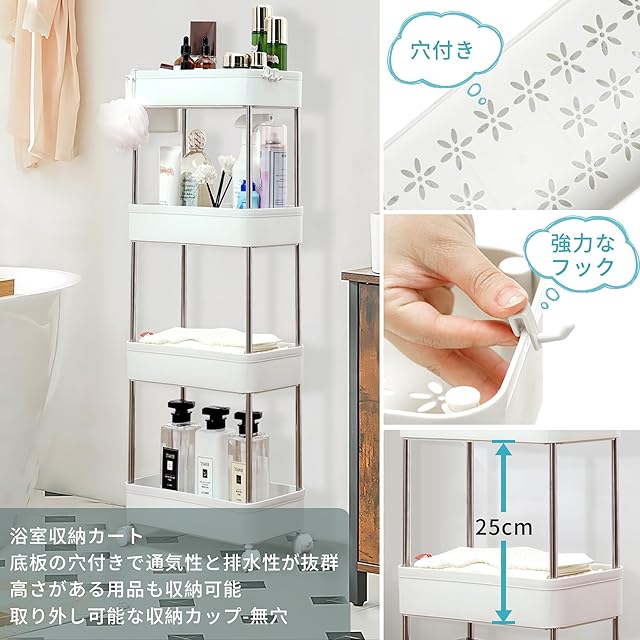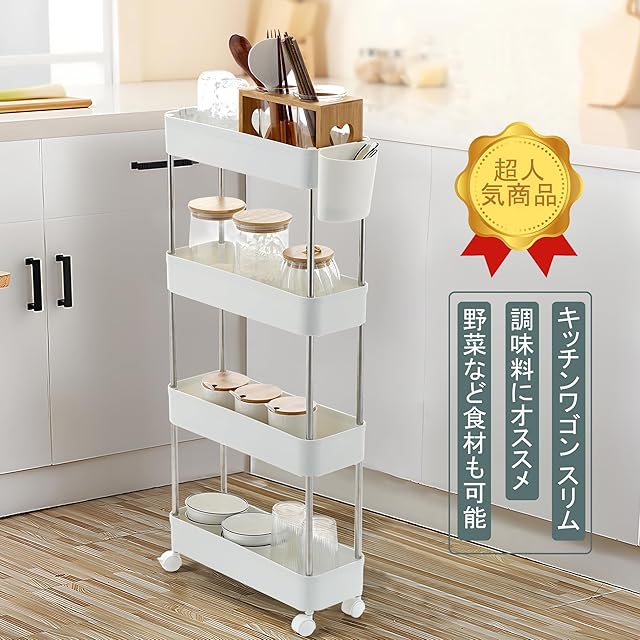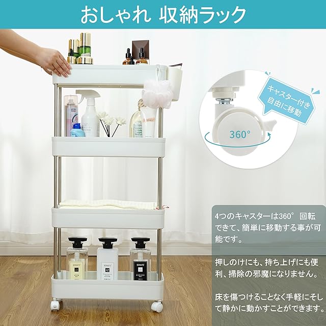 【優れた機能性】 新登場した四層ホワイトワゴン!!!家庭用収納に最適。トイレ、ベッドルーム、キッチンなど、さまざまな場所で大活躍します。コンパクトなサイズと軽量な設計なので、どんな場所にも簡単に移動でき、部屋の隙間にもすっきりと配置できます。 四層の収納スペースがあり、さまざまなアイテムの収納に便利です。小物入れも付いており、雑多なアイテムをスッキリと整理できます。収納力も抜群で、生活空間をスッキリと整えることができます。