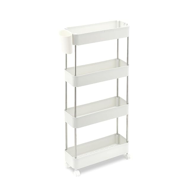 VECELO キッチンワゴン (スリム) キャスター付き 4段 おしゃれ 洗面所 収納棚 スリムラック 収納カート 隙間収納 トイレ収納 調味料 食品 小物 台所 冷蔵庫横 多機能 軽量 細い棚 移動式 オープンシェルフ スリムワゴン 頑丈 組立簡単 幅15x奥行40x高さ86.5cm ホワイト