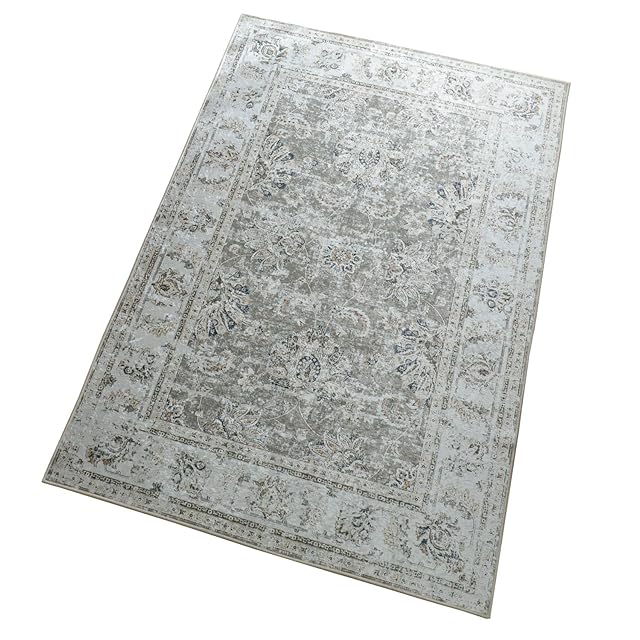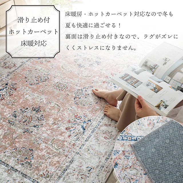 【シルクのような光沢と肌触り】毛足が短く、遊び毛の出にくいしっとりとしたペルシャ絨毯風のプリントラグです。しっとり、さらさらとした肌触りで、素足でも過ごせる気持ちよさがあります。また、光沢感があり、光の加減で全然違う印象にもなります。表情豊かで、飽きにくく、高級感のあるラグです。近づいてもプリントとはわかりずらい点もポイントです。また、裏面には滑り止めがついているので、走り回ってもずれにくくなっています。