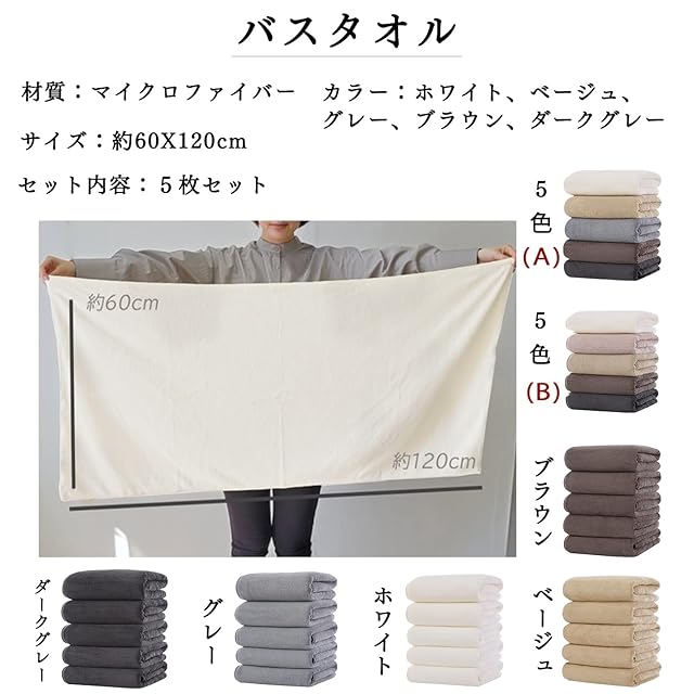 【バスタオル 5枚セット】材質:マイクロファイバー サイズ:約60×120cm カラー:ホワイト、グレー、ベージュ、ダークグレー、ブラウン ※自分用はもちろんですが、大切な人へのプレゼントにもピッタリです。業務用もおすすめです。