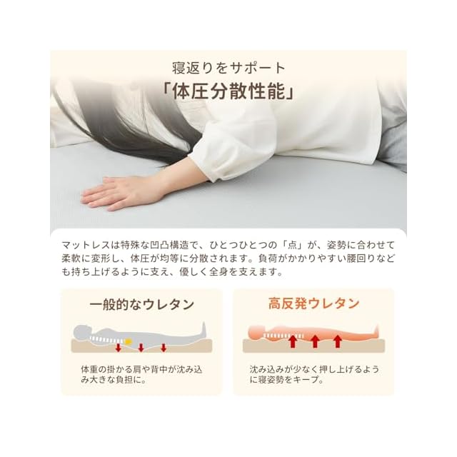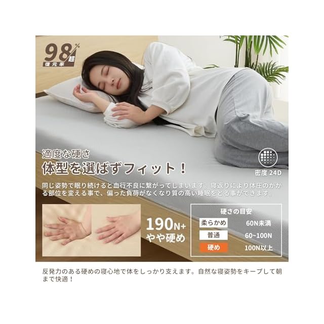 【体型を選ばずフィット!】やや硬め190N。一般的なウレタンは柔らかすぎるので、体重の掛かる肩や背中が沈み込み大きな負担にかける。こちらの高反発マットレスは硬すぎず、柔らかすぎず、適度な反発力のある硬めの寝心地で体をしっかり支えて、自然な寝姿勢をキープして朝まで快適!