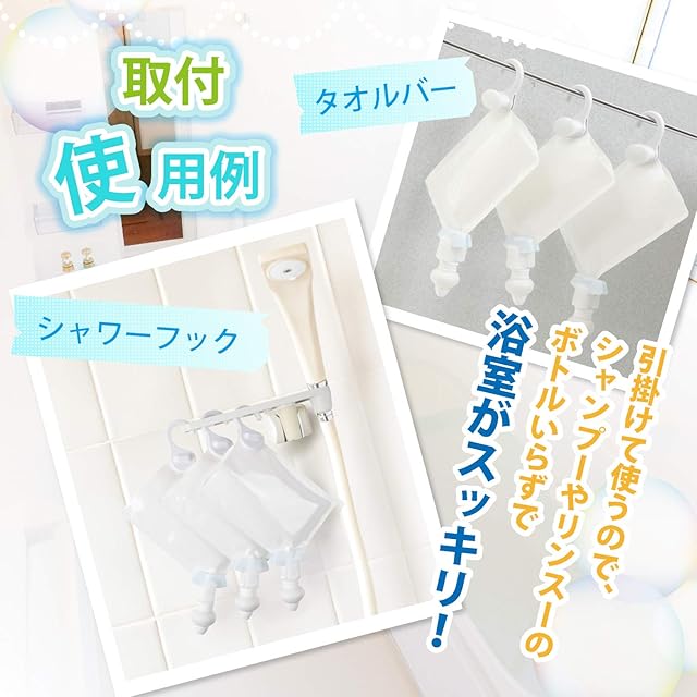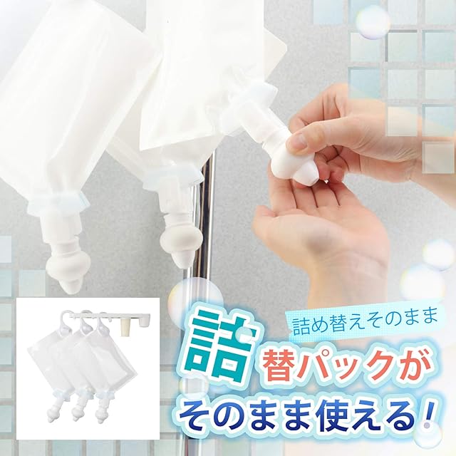●詰め替えパックをそのまま使用できるので、ボトル容器は不要 ●詰め替えの手間(洗浄・乾燥・補充)がいらない ●取付、取りはずしは簡単ワンタッチ ●中身は空気にふれない為、最後まで清潔で香りも新鮮 ●バスルームでボトルの置き場所をとらない ●最後まで残らず使える