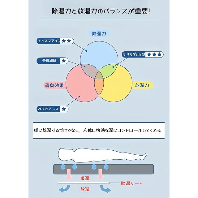 【消臭・防カビ・防ダニ効果で快適に】ジメジメ知らずで睡眠環境を整えてくれる、強力な除湿(乾燥)効果でダニを寄せ付けにくく、カビの発生を抑え、敷き布団やベッドを清潔に保ちます。さらに、いやなにおいの原因となる汗臭・アンモニア臭・加齢臭も吸収し、睡眠環境を整えてくれます。
