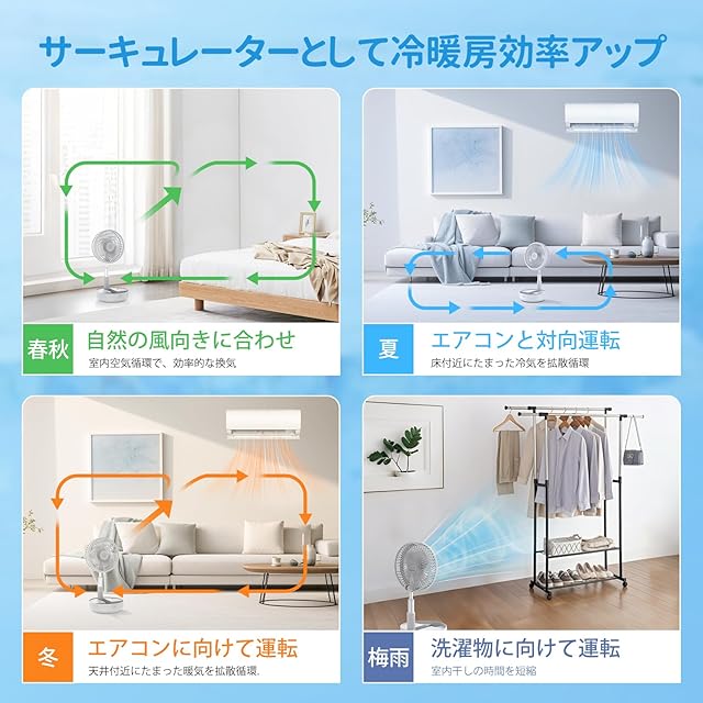 【自動首振り&四季通用】Primeloveコードレス扇風機は、左右90°自動首振り機能で広範囲に風を届け、上向きも手動で約180°無段階調節可能。部屋の隅々まで快適な風を均一に行き渡らせます。サーキュレーターとしても大活躍、暑い日はエアコンと併用することで冷気を効率的に循環。室温をムラなく保ちながら省エネ実現。梅雨時は室内干しの生乾き臭を防ぎ、冬は暖房の熱を部屋全体に拡散し暖房効率を向上。猛暑対策・除湿・換気まで、季節を問わず一年中活用できるマルチ機能で、快適な室内環境をトータルにサポートします。
