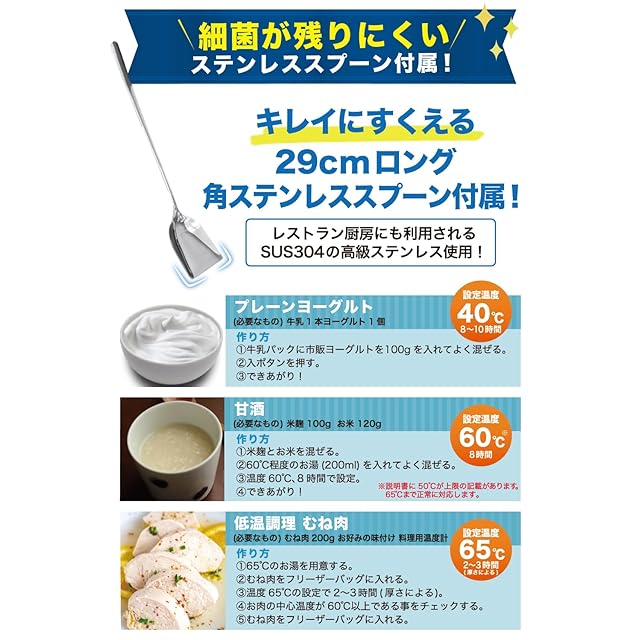 ステンレススプーンで清潔かつ快適に!プラスチックスプーンは使い続けると細かな傷が原因でコンタミネーション(培養前の細菌混入)を起こす可能性が高まります。ステンレススプーンでは常に清潔に安心して種菌を扱えます。幅広ヒーターによる立体加熱構造のおかげで、設定発酵温度までスピーディーに上昇させます。500mlの場合はおおよそ1時間程度、1,000mlの場合は2時間程度。冬場でも冷蔵庫から出したそのまま発酵開始しても、次の日には失敗する事なく美味しいヨーグルトが出来上がっています。多くの方がヨーグルト作りを失敗される原因を徹底的に解消致しました。底面から暖めていく事によりパック内に対流をおこし『均等』に発酵を行います。