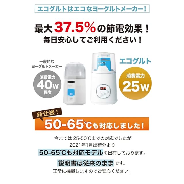 2021年1月出荷分から最大65℃まで対応しました。説明書には50℃の記載がありますが、正常に対応致しますのでご安心くださいませ。エコグルトは独自制御プログラムで日本の牛乳パックに特化した圧倒的な温度安定性を誇るヨーグルトメーカー❗ヨーグルトメーカーで最も重要なのは温度を正常にキープできるかという事。エコグルトは温度安定性を徹底的に追及し、複数回の調整を踏まえ温度差4.0℃以内に収まるように調整されています。驚く事に平均的なヨーグルトメーカーは42℃発酵の際に5.0℃~10.0℃程ずれるケースが多く見られます。42℃発酵で4.0℃以上ずれる場合はいかなる理由でも返品・交換をお受け致します❗ご安心してご利用ください。