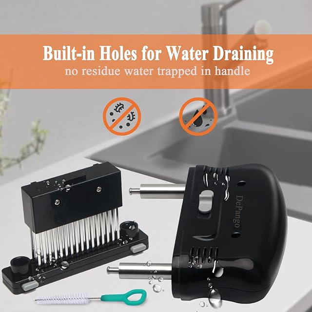 キッチンの必需品ミートテンダライザー - DePangoは、普段使いの台所用品を作り変え、シェフ、グルメ、料理の達人、愛好家にとっての利便性を高め続けています。耐久性に優れた48刃のテンダライザーニードルは鋭く頑丈で、分厚くカットした肉も突き通します。ビーフブリスケット、チキンブレスト、ポークチョップ、ロンドンブロイル、ボストンバット、ラム、ダックに適しています。硬くて淡白な肉をジューシーで柔らかくて風味があり、口の中でとろける肉に変えます