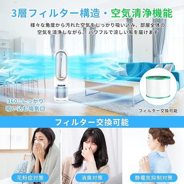 商品名:【2025最新空気浄化・羽無し・冷暖兼用】タワーファン リビング扇風機 羽なし空気清浄機 セラミックファンヒーター 温風 冷風 冷暖房 サーキュレーター 羽根なし扇風機 DCモーター 8段階送風/3段階暖風 大風量 100°左右首振り 8H切タイマー HEPAフィルター 消臭/集じん 花粉症対策 梅雨 衣類乾燥 過熱保護 転倒自動オフ お手入れ簡単 PSE認証済 日本語説明書