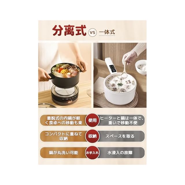 【お手入れカンタン】分離型デザインで、内鍋は取り外せて拭いたり洗ったりしやすく、後片付けの手間を軽減できます。鍋はフッ素加工で焦げ付きにくく、焦げ付きも防げるため、清潔な状態を保てます。 長いハンドルもないので、保管スペースを節約できます。