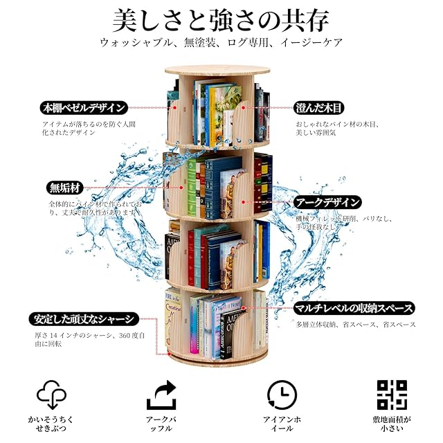 【360度回転ディスプレイ本棚】: この天然松材回転本棚は、底部にサイレントベアリングターンテーブルが装備されており、回転中に揺れがなく、本棚全体が360度回転でき、必要な本を簡単に手に入れることができます。歩き回らずに
