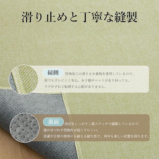 【季節を問わず快適】夏はさらっと涼しく、冬は床暖房との相性も◎。滑り止めドット付きで、高齢者や子ども、ペットがいるご家庭でも安心。一年中快適に使える万能ラグです。