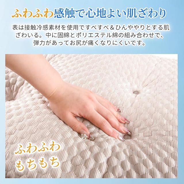 【へたりにくいポイントは3層クッション構造】表面はひんやり接触冷感生地で涼しげな座り心地、裏面は通気性のよいニット生地を使用しております弾力のある固綿を吸放湿綿で包んだ3層構造で、しっかりボリュームアップへたりにくいから長時間使っても快適