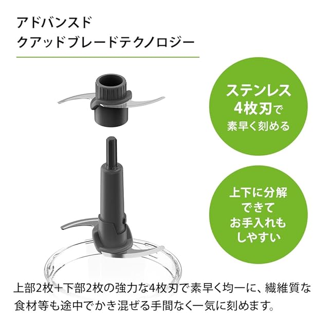 クアッドブレードテクノロジー:ステンレス4枚刃搭載で素早く正確に攪拌します。