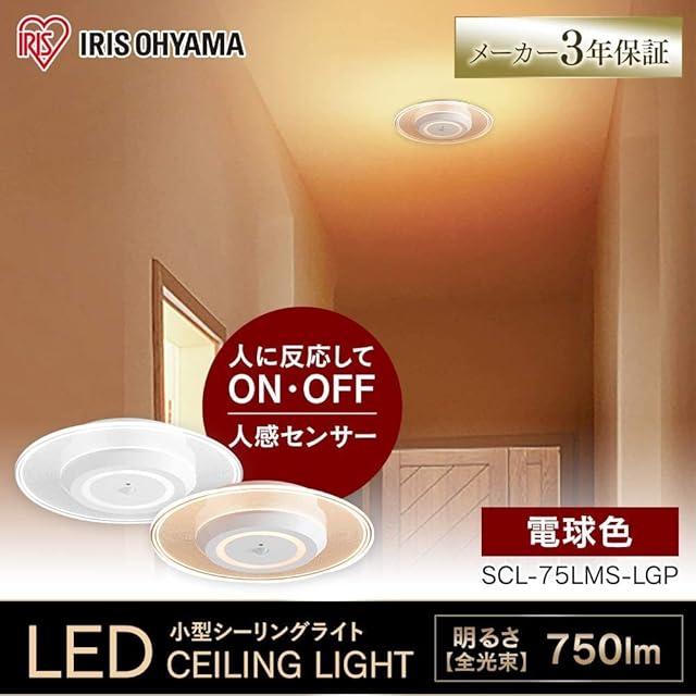 アイリスオーヤマ(IRIS OHYAMA)【人感センサーで節電対策・照明工業会加盟】アイリスオーヤマ 小型シーリングライト パネルライト 導光板 廊下 玄関 洗面所 トイレ 750lm 人感センサー付 電球色 SCL-75LMS-LGP