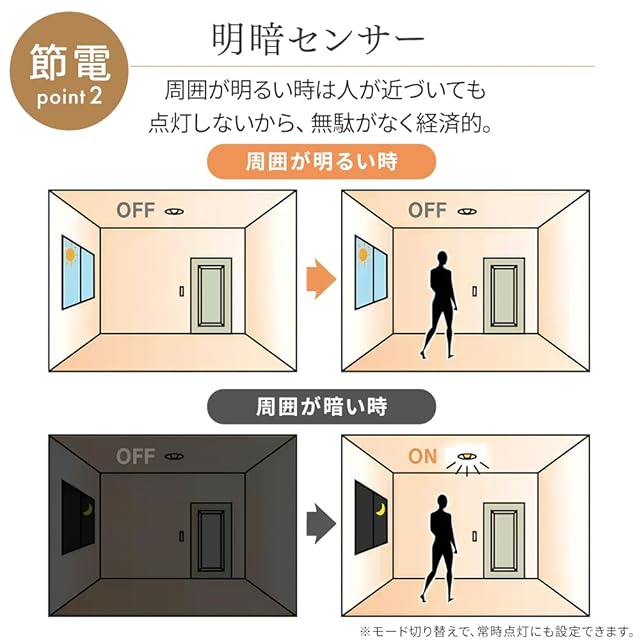 色温度: 3000K●器具光束: 750lm●演色性: Ra80●待機時消費電力: 0.35W●入力電流: 0.13A●設計寿命: 40000時間●質量:約220g●点灯時間:約90秒、約30秒(人感センサー動作時)/連続●照度センサー感度:約100lx●感知範囲: 2.4m高さで直径4.0m(80°)