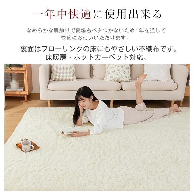 【オールシーズンカーペット】このラグの毛足は、通気性が良く、速乾性にも優れたマイクロファイバーを採用し、踏み心地は柔らかい、夏はサラッと快適に、冷房機器との併用で快適に過ごせます。耐熱加工を施しているので冬はホットカーペットや床暖房の上に敷いてもお使いでき、フワフワと暖かく、居心地がよくなります。
