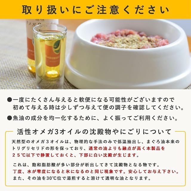 ※一度に沢山与えると、軟便になる可能性があります。初めに少しづつ与えてあげて下さい。※魚油の成分を均一化するために、よく振ってご利用ください。