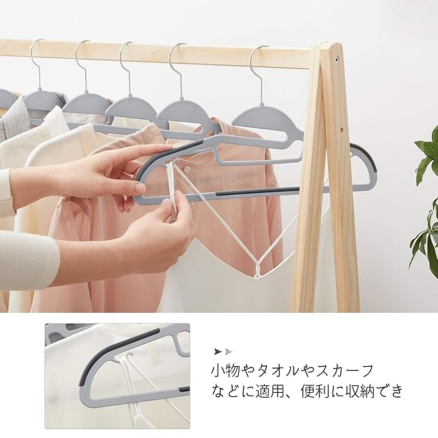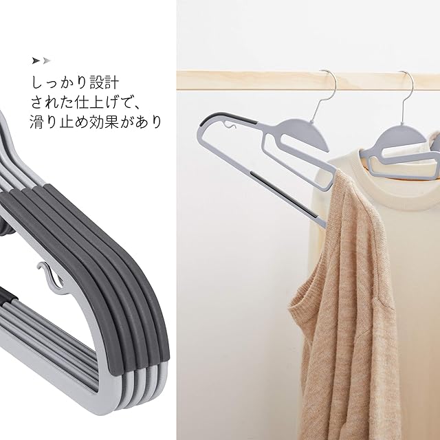 【滑らない設計】ハンガーの肩部と下側は3か所の滑り止め加工をして、衣類の型崩れを防ぎ、小物やタオルやスカーフなどがズレ落ちにくくなる非常に頼もしいハンガーです