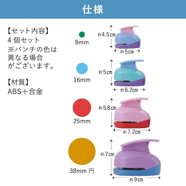 【サイズ】3*5*4.5cm/3.6*6.2*5cm/4.2*7.2*5.8cm/5.5*9*7cm 【切り抜きサイズ】9mm、16mm、25mm、38mm 【材質】Abs + 合金 【セット内容】4種類各1個 ※色は商品写真とは異なる場合がございます ・4つのサイズ: 9mm、16mm、25mm、38mmのサークル柄を手軽に作成可能です。 ・幅広い用途: グリーティングカード、スクラップブッキング、立体作品、装飾に適しています。 ・紙に最適: 紙専用の型抜きパンチで、厚さや品質による制約が少ない。 ・パンチのハンドル部分が大きく、強い力を必要とせず、簡単に切り抜くことができます。 ・大人がグリーティングカード、メッセージカード、クリスマスカード等に使用する他、お子さんが色々ものを切り抜くことにも楽しめます。