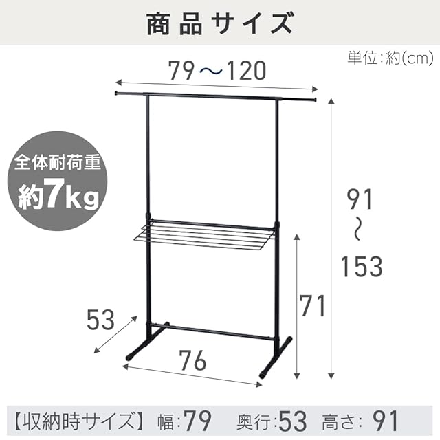 商品サイズ(cm)<使用時>幅約79~120×奥行約53×高さ約91~153<収納時>幅約79×奥行約53×高さ約91