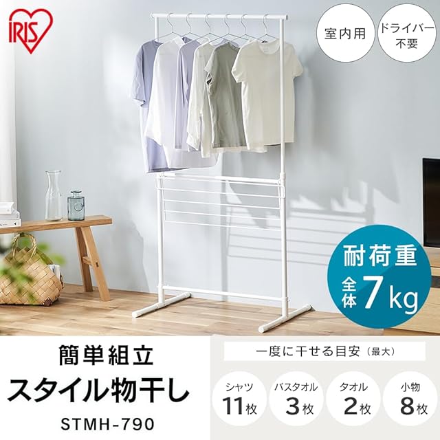 一度に干せる目安(タオルハンガー使用時):シャツ等:11枚、バスタオル:3枚、タオル:2枚、小物:8枚 ※ハンガーとピンチハンガーを使用