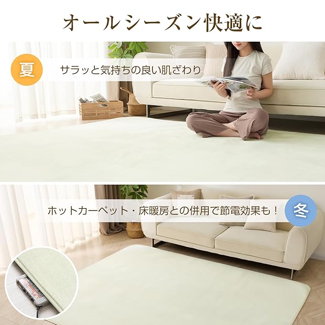 【フランネル素材でオールシーズン快適に】きめ細かく柔らかいマイクロファイバーを高密度に織り込んだラグマット。なめらかな肌触りに加え、毛の流れや光の当たり具合によって色合いや雰囲気が変化し、さまざまな表情をお楽しみいただけます。 さらに素材の特性により、夏はさらっと涼しく、冬はあたたかく、季節を問わず一年中快適にお使いいただけるカーペットです。