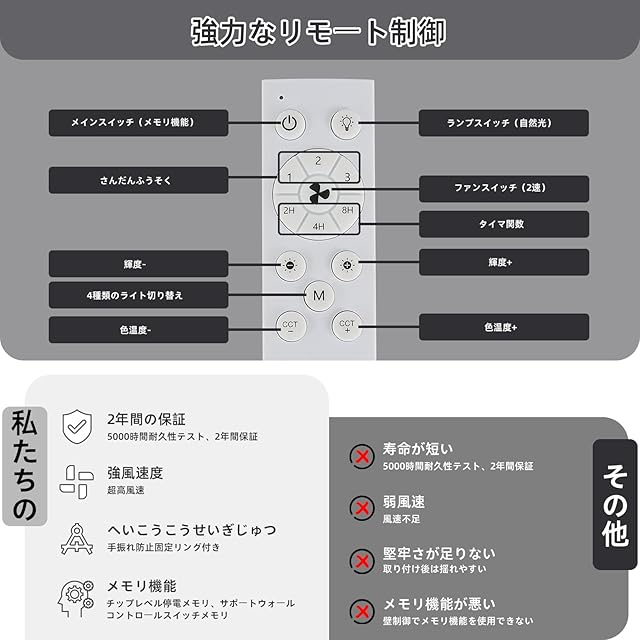 高性能リモコンはペアリング必須: 強力リモコン搭載。初回使用前にペアリング操作必須:壁スイッチオフ→リモコンボタン長押し→スイッチオン→ファン点滅。多くのリモコン不具合は未ペアリングが原因です