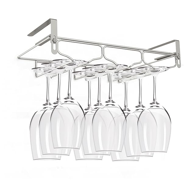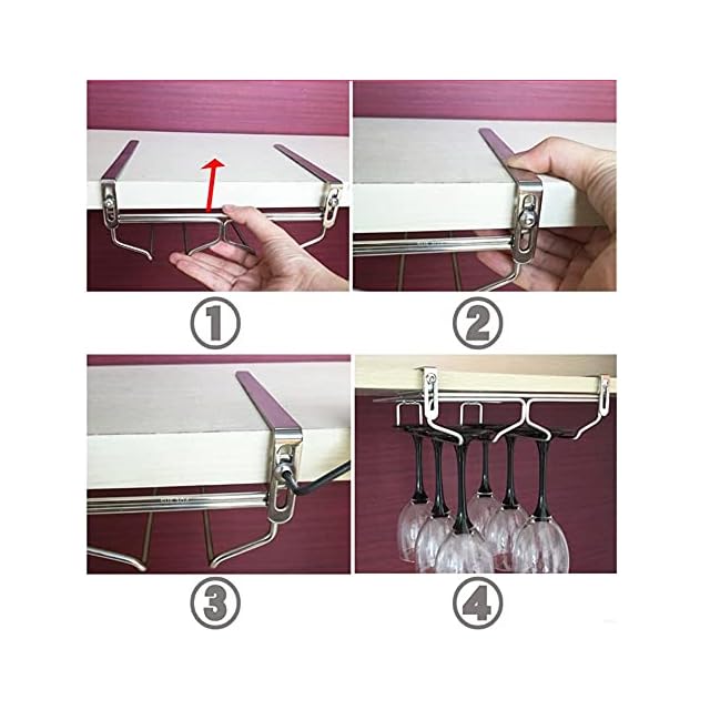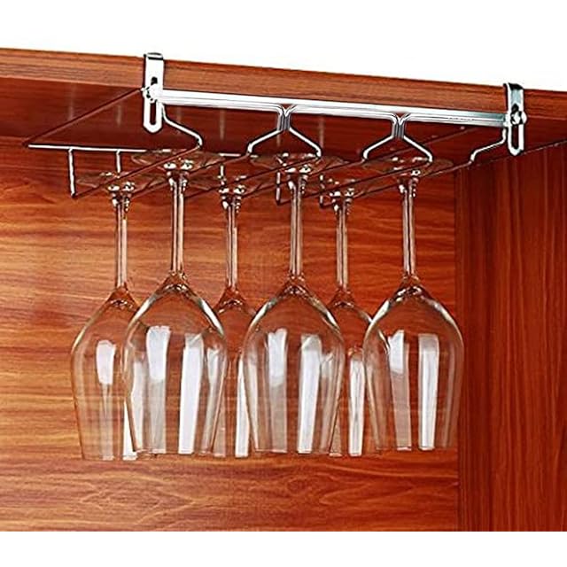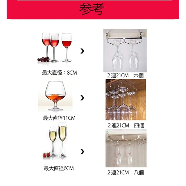 ワイングラスホルダー 吊り下げ ステンレス製 穴あけ不要 棚厚さによって調節可能 (3レーン)