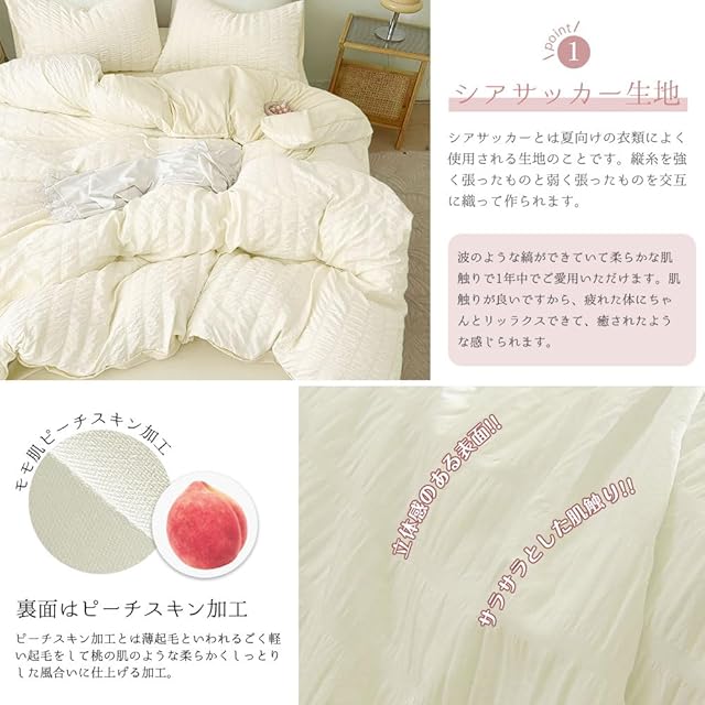 商品名:布団カバーセット シアサッカー生地 シングル ダブル 寝具カバーセット 3点セット 掛け布団カバー ボックスシーツ 枕カバー 可愛い 柔らかい 快適 通気性 速乾タイプ 丸洗い オールシーズ(セミダブル4点セット、アイボリー)