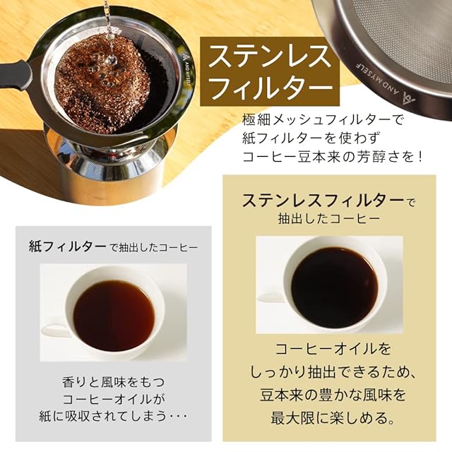 ☕【淹れる。】ステンレス製の極細メッシュフィルターはオイルをそのまま抽出。コーヒー豆本来の風味をストレートに楽しめます。紙フィルターと違い消耗品ではないので、エコで長くお使いいただけます。