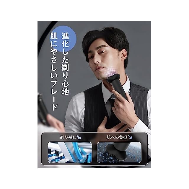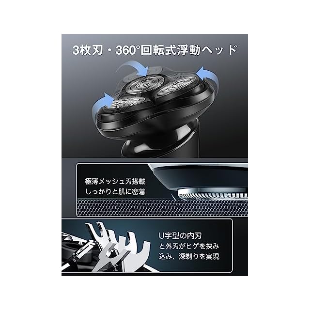 【3D回転式・極薄メッシュ刃・自動研磨システム】シェーバー は 極薄メッシュ刃が搭載し、V字型の内刃と外刃がヒゲを挟み込み、逃すことなく確実に深剃りを実現します。3つの丸みを帯びたコンフォートカット刃がお肌を守りながら、アゴ下や頬の小さな凹凸に均一に圧力がかかりやすく、肌にやさしく密着し、快適な 髭剃り を実現します。ひげそり 電動シェーバー は自動研磨システムを搭載しており、回転するたびに内刃が外刃で研磨され、常にシャープな切れ味。長持ちしやすく、耐久性が優れています。