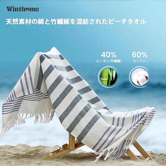 商品名:Winthomeビーチタオル 竹繊維タオル 砂防止 吸水速乾 綿・バンブーレーヨン混紡 抗菌竹繊維入り防臭 柔らかい プールタオル ストライプ柄 フリンジ付き アウトドア 海水浴 旅行用タオル 大判 (180*100cm, ストライプ柄(グレー))