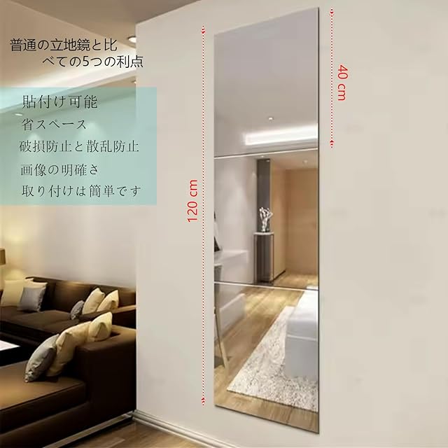 【割れにくい&地震対策】アクリル製のフィルムミラーはガラスよりも耐衝撃性が高く、割れにくいため、子どもやペットがいる家庭でも安心です。壁に貼る鏡や鏡壁、ドア掛けミラーとしても使え、全身鏡や姿見 おしゃれなデザインにも最適です。鏡 シートや鏡 シールのように簡単に貼り付けられ、軽量でミラーの割れない特性を活かしています。地震時にも安全です。