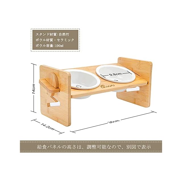 「セット内容&サイズ」:セット内容:陶器フードボウル*2、竹製フードボウルスタンド*1。サイズ」:セラミック( 陶器)フードボウル、竹製スタンド。 フードボウル内径9.8cm 、容量190ml。竹製スタンド幅36cm 、奥行14.2cm 。餌台面 の高さは4.8cm-10.8cm調整可能。