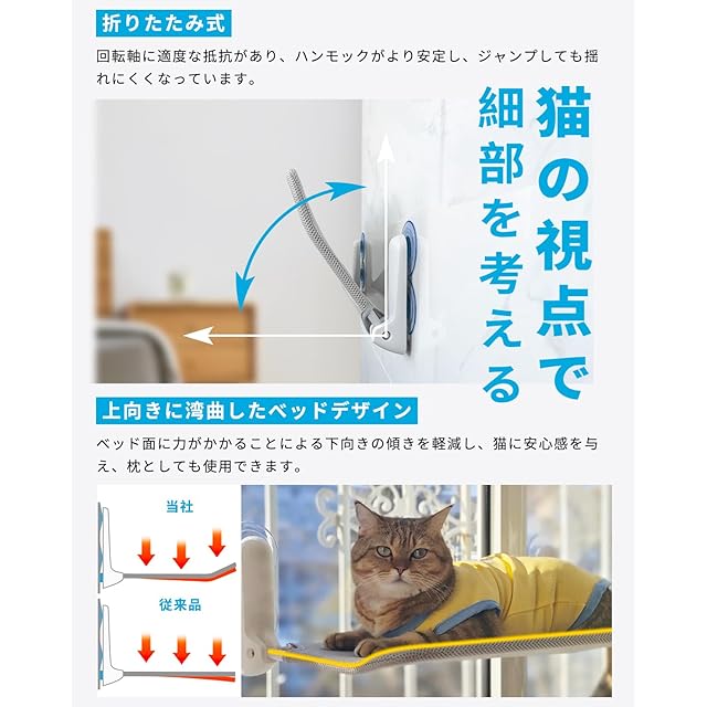 【猫の視点で細部を考える】①折りたたみ軸の抵抗を調整できる設計により、ベッドが突然開いて猫にぶつかり、驚かせるのを防ぎます。使用しないときは折りたたんで収納できるため、カーテンやブラインドの使用を妨げることはありません。キャットタワーやキャットウォークよりも場所を取らず、室内スペースを効率的に活用できます、②上向きにカーブしたベッド形状は、下方向への傾きを抑え、愛猫の安心感を高めます。また、枕としてもご使用いただけます。