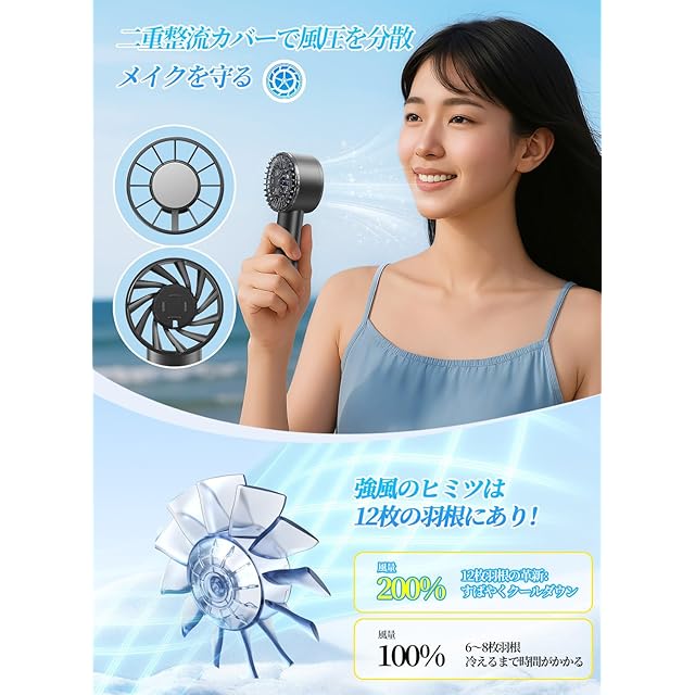 【革新的12枚羽根・自然風に近い極上の涼感】 業界でも希少な直径6cm・12枚羽根の革新構造を採用。多翼設計により従来品より風力が強く、さらに音は静かで穏やか。二重整流カバーが空気の乱れを整え、まるで森林の中を吹き抜けるそよ風のように自然で柔らかな風を届けます。髪が乱れずメイク崩れも防げる、女性やオフィスワーカーに理想的な高品質な風感を実現しました。