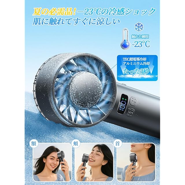 【瞬間冷却技術・-23℃究極冷感を実現】 真夏の猛暑を一瞬で快適にする超冷感ペルチェプレートを搭載し、直径3.4cmの冷却プレートが3秒で-23℃の驚異的な冷却効果を発揮。火照った肌に触れる瞬間、まるで氷を肌に当てるような心地よさを感じられます。さらにワンタッチで簡単に冷却機能のオンオフが可能。夏場の通勤通学、外出、アウトドア、花火大会などあらゆるシーンで熱中症対策に最適です。