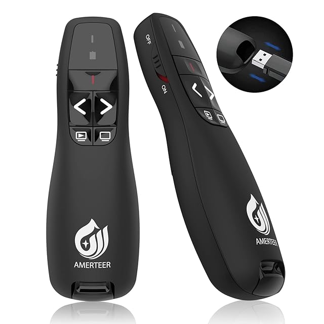 AMERTEER レーザーポインター PPTスライド用リモート ワイヤレス プレゼンター 単四電池式 リモートコントロール PSC認証済み ハイパーリンク操作 PowerPoint、Keynote、Googleスライド用リモート等対応 収納パック付き ブラック (015)