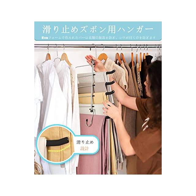 【滑り止めハンガー】ズボンハンガーのバーはEVAフォームで作られて、ズボンを掛けると、滑ることを心配しなくていいです。バーは柔らかで服を傷つけません。
