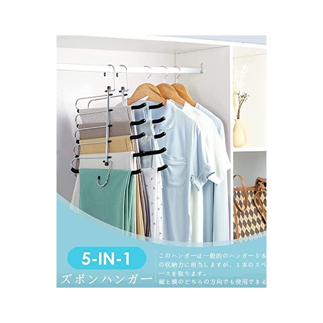 【省スペースハンガー】このハンガーは1枚で 5本のズボンを収納できますが、元のハンガーのスペースしか占有しません。ズボンを掛ける時はハンガーを横置き、操作をより便利に!また、ハンガーを縦に掛けると省スペースになります。押し入れのスペースを有効に活用して、より多くの衣類を収納できます。